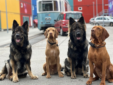 Daika eine Altdeutsche Schäferdame mit 9 Jahren, Viva ihre Tochter aus eigener Zucht mit nun 5 Jahren, Käthe eine Magyar Vizsla Hündin die 3 Jahre alt ist und Laci unser Magyar Vizsla Rüde mit 2